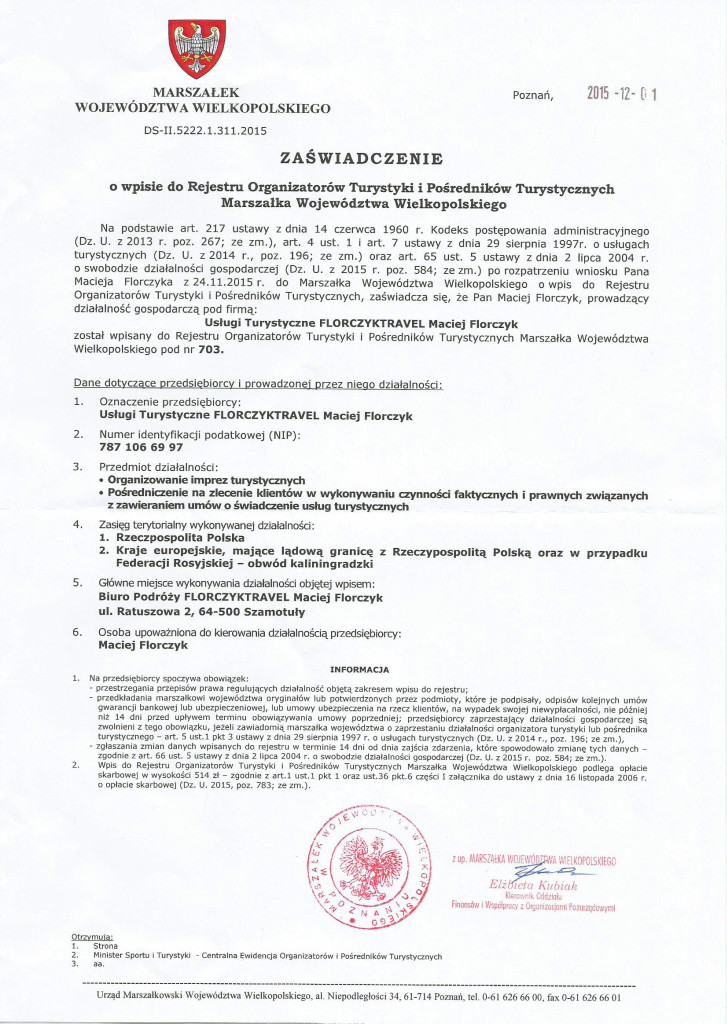 tel. +48-61-29-26-183,kom. +48-609-651-086,biuro@florczyktravel.euul. Ratuszowa 9, 64-500 Szamotuły